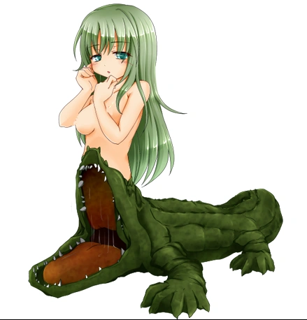 “A land-dweller monster with alligator characteristics. She appears calm at a glance, but she is carnivorous and expresses her ferocity when she attacks prey. The alligator mouth on her abdomen is very powerful, and poses the threat of swallowing anyone caught in the strong bite of her jaws. However, she only hunts when she is hungry, and is usually seen relaxing by the waterside.