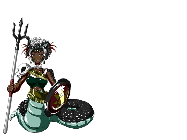 Black Mamba is one of the strongest lamias, and her skills as a warrior were the greatest in the world five-hundred years ago. Her spear has a reputation for being able to pierce anything, but because she prefers not to end battles quickly, she fights rather cautiously. Any man she defeats will become her prey and have their semen squeezed. She isn’t very brutal for a lamia, and rarely kills men with pleasure.”