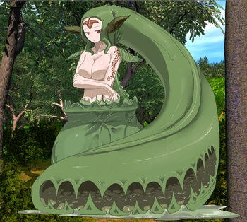 “A plant monster, she is also the oldest Canaan Sister. Her hair is a predation organ capable of dissolving both humans and insect monsters. She eats her prey in an almost businesslike manner, quickly eating them so she can return to more important tasks. Looking at the prey with bored eyes, she will watch them slowly dissolve in her organ.