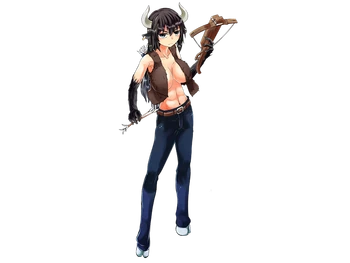 “A rarity among her tribe, she is an intelligent Minotaur adept with technology. In the past she was responsible for the maintenance of weapons and, in dealing with other minotaurs, had polished her smithing skills. With the recent advent of Makina technology, she has also acquired advanced mechanical technology. Her dexterity and intelligence are superior to other minotaurs, but she is physically weaker by comparison, resulting in an inferiority complex.