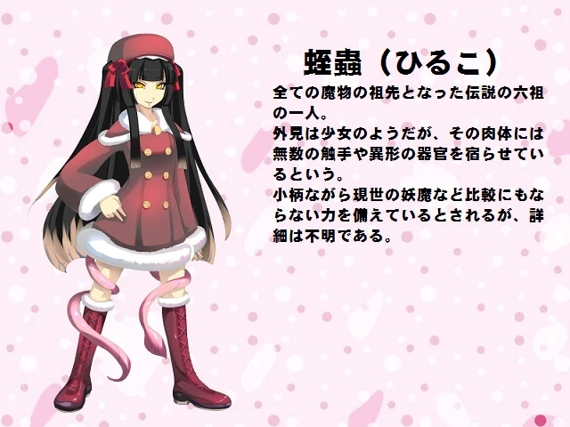 Hiruko (蛭蟲) is one of the Six Ancestors, of the Scylla bloodline. Although her appearance is just like a normal girl’s, it is said that she’s hiding numerous tentacles and abnormal organs inside her body. It is also said that she has far more power than modern monsters, but the specifics are unknown.