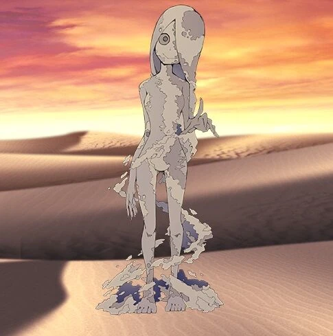 She looks like a mud doll, and can freely manipulate the mud to divide or multiply herself.