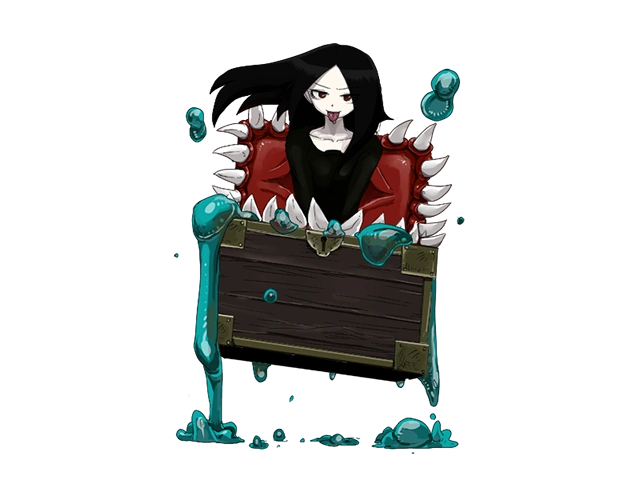 “A monster that hides in a treasure chest, it appears to be a part of the Ghost family. Their body is composed of the chest and their digestive juices contained inside. When an adventurer opens the chest, the Mimic will drag them inside and slam the lid shut, bathing them in digestive juices.