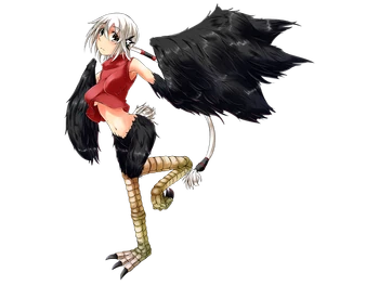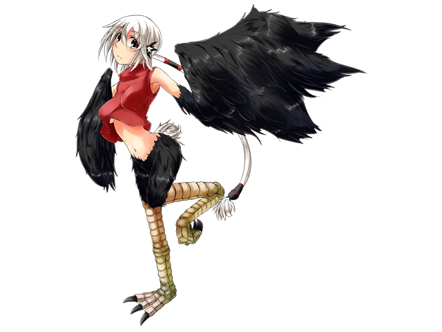 “An ostrich monster that is a variant of the Harpy race. She cannot fly in the sky, but she takes pride in her great physical abilities and excels in combat through the use of her strong legs. Although she runs around hastily, her personality is calm, and she is friendly towards humans. Many people run businesses that make use of her leg strength, such as delivering fresh water from the oasis to the town and back.