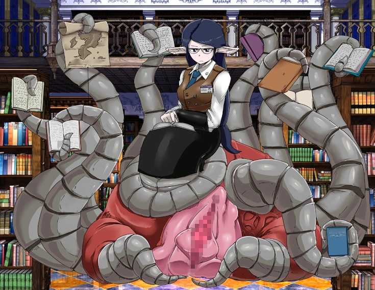 “A Queen-like monster that possesses a book. Having possessed many different books up until now, her name is derived from how many different pages she has possessed. Boasting very powerful magic, any man who opens the book she is in will be quickly dragged into her world. Dragging them into her body, she is able to force any man to ejaculate. Any man caught by her will be forced to continuously ejaculate until nothing is left. Unusual among other monsters that possess books, she prefers to quickly squeeze her catches to death instead of keeping them alive.