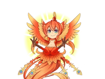“A Phoenix Girl who is regarded as a sacred bird of immortality. She is said to repeatedly reincarnate in flames and, due to being reborn just recently, bears the appearance of an innocent girl. While she was taking a stroll outside of the volcano she met Don Dahlia, who persuaded her to be exploited. Because she has never had contact with other humans before, and Don Dahlia constantly admonishes her about human malice, she has begun to fear them.