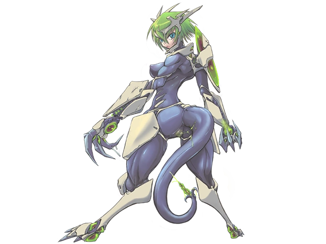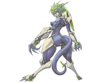 Riot bears characteristics similar to beast monsters, but because she has mechanical parts fused all over her body, it is uncertain whether she is a natural being at all. Very prideful and ferocious, she will stop any intruders with her overwhelming physical abilities.