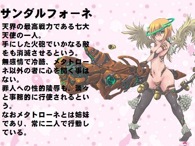 Sandalphone (サンダルフォーネ) is one of the Seven Archangels and sister of Metatrone (メタトローネ) from Monster Girl Quest: Paradox.