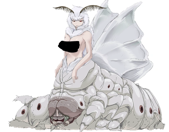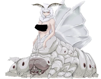 “An insect monster with the characteristics of a silkworm. Capable of spraying sticky silk from her abdomen, she rolls up her prey in a cocoon. As her silk is able to infuse the prey with sexual pleasure by mere contact, they will be brought to climax over and over. Capable of absorbing semen through the silk itself, the Silkworm Girl is able to obtain nourishment.