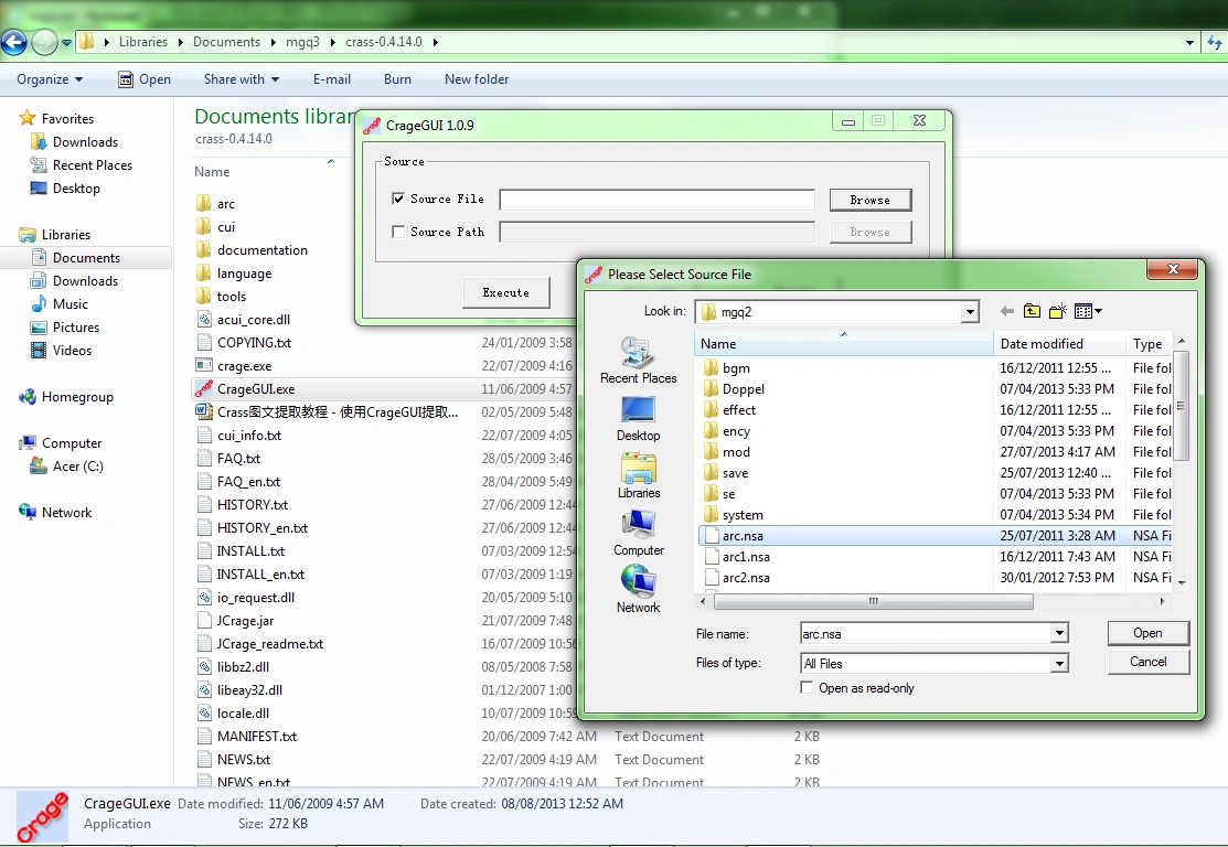First, extract the crass-0.4.14.0 folder from the .7z file and save it anywhere on your hard drive. Open "CrageGUI.exe". Select "Source file" and browse for the .nsa file which you wish to extract.