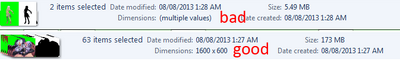 of 960000 pixels and filesize of 2813KB. However, some images have the same filesize but different dimensions - for example, "delh_a_st01.bmp" has the dimensions 1200x800, which gives the same area and filesize as most 1600x600 images. To be sure, click "show more details..." in the bottom info bar of windows explorer and make sure it does not say "(multiple values)" for dimensions.